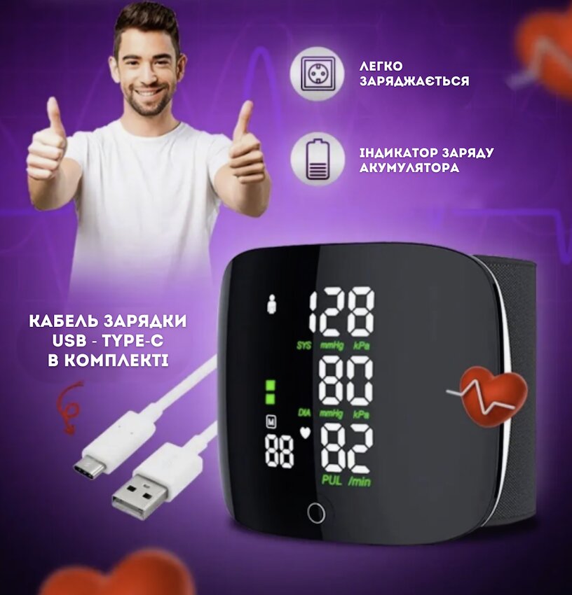 М'яка та регульована манжета на зап'ястя забезпечує комфорт під час вимірювань. Після використання тонометр можна зручно заряджати від мережі за допомогою USB Type-C кабеля, що робить його практичним та завжди готовим до використання.